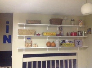 I forgot to bring my homework home with me tonight. I literally carry my book bag with me almost every where I go just in case I have a bit of time to be reading or at least checking on things. Today I left work and made it all the way home before realizing it was still sitting in my office. Instead of going back for it, I decided to work on my kitchen. It’s disorganized state has been driving me nuts. So I went to Menards, bought some shelves and hung them with the aid of a certain muscular guy and his working drill (sadly, my drill died completely a couple weeks ago). Hanging the shelves meant I had to remove a cabinet, empty its contents and find new places to put everything. But it’s amazing the difference already. Its not quite finished, but it feels a little larger and has added a lot of storage. The only downside is that I need to find a new home for the chalkboard. But so far, it’s worth it. I’m thankful to have better organization and a way to free up my counters. Less clutter will (hopefully) make the kitchen easier to work in and keep clean. And save my sanity.