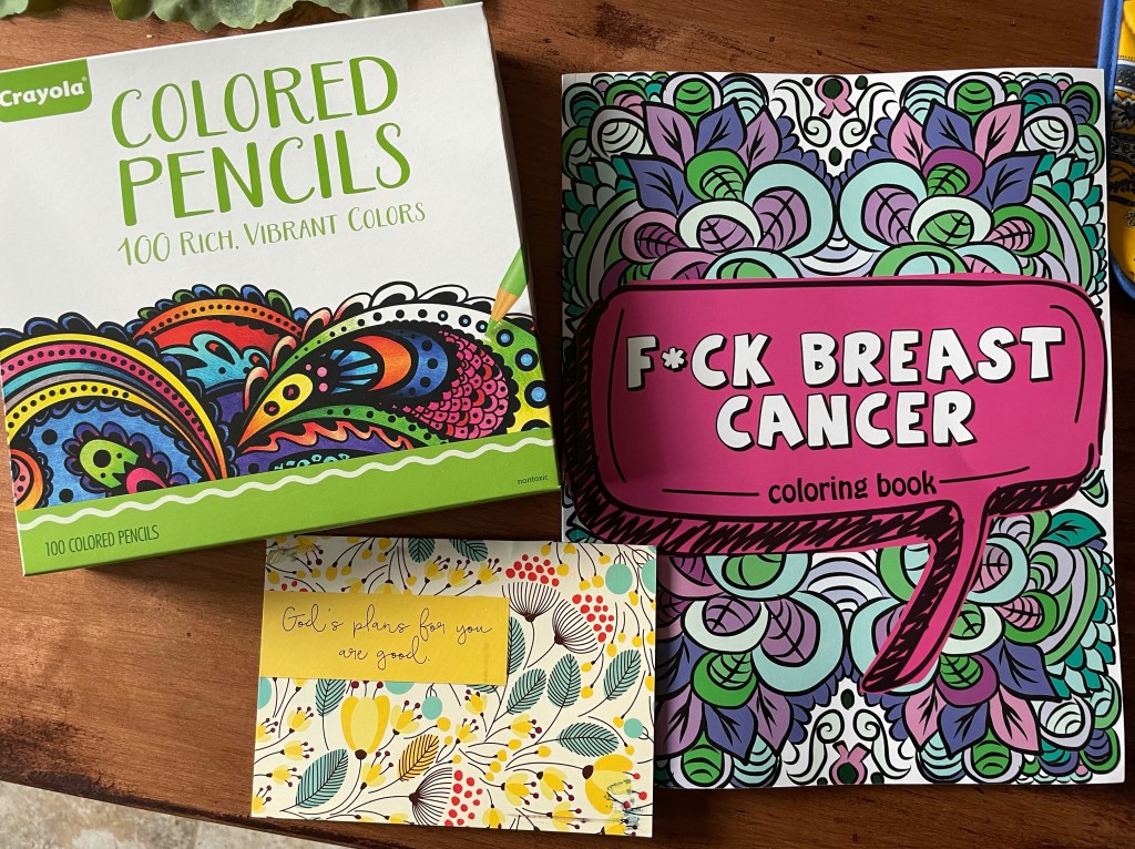 I’m thankful for these today! My sister-in-law sent me this funny coloring book and pencils and my sister sent me an encouraging postcard. Love them both!
