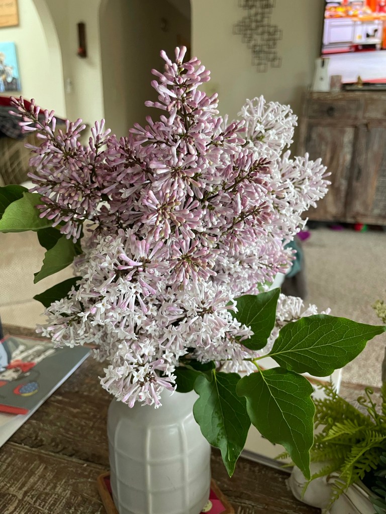 So while I’m relaxing this evening, I’m thankful for the smell of lilacs. Our rather large lilac bush is blooming, and we brought some branches inside. It’s crazy how just a few blooms can make an entire room smell wonderful. Well, it’s wonderful to me because I love lilacs. Patrick even used some of the blooms to make infused bath salts, so I have that to look forward to. And when the lilacs fade, I have my peonies to bring in, another favorite of mine. I’m so happy that they’re blooming this year!