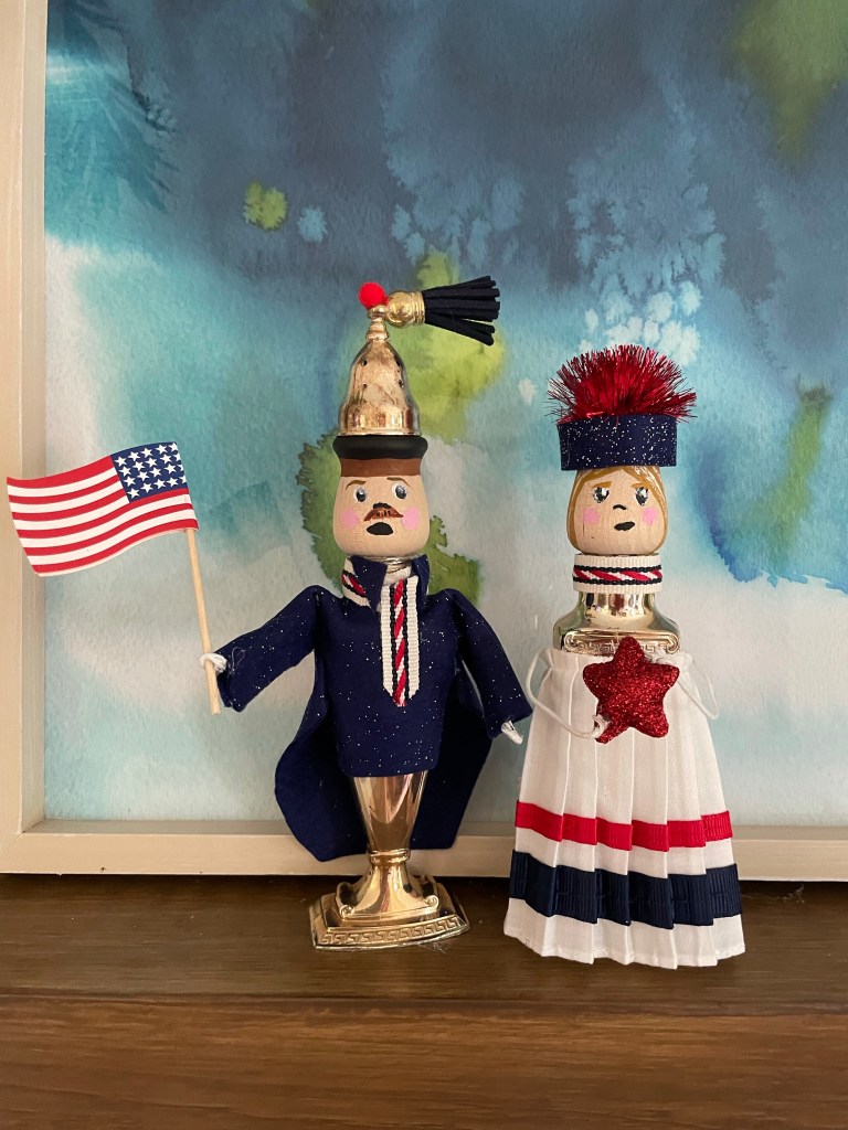 I crafted today! I think I needed to be creative and spend time focusing on something other than my frustrations, especially when there isn’t much I can do about them. Plus it’s been about 100 degrees outside these days, so staying in the air conditioning was good. One thing I made was a 4th of July couple from silver salt and pepper shakers. They’re not great, but it was fun.
