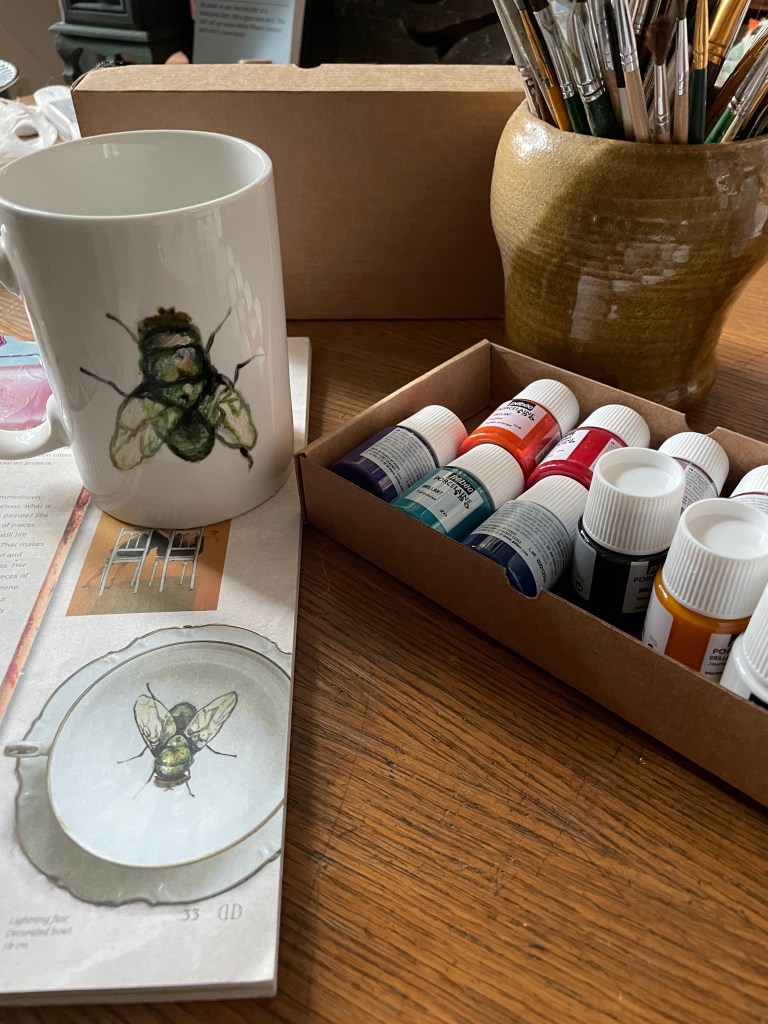 I got new paint! I read about an artist, Ellen Kroeze, who uses old China and paints objects over the existing patterns. Her stuff is beautiful! I highly suggest looking her up. And even though I don’t need another project, it looked so interesting that I wanted to try it. After a bit of research, I found Pebeo porcelain paint that works like watercolor and after baking, is permanent and dishwasher safe.