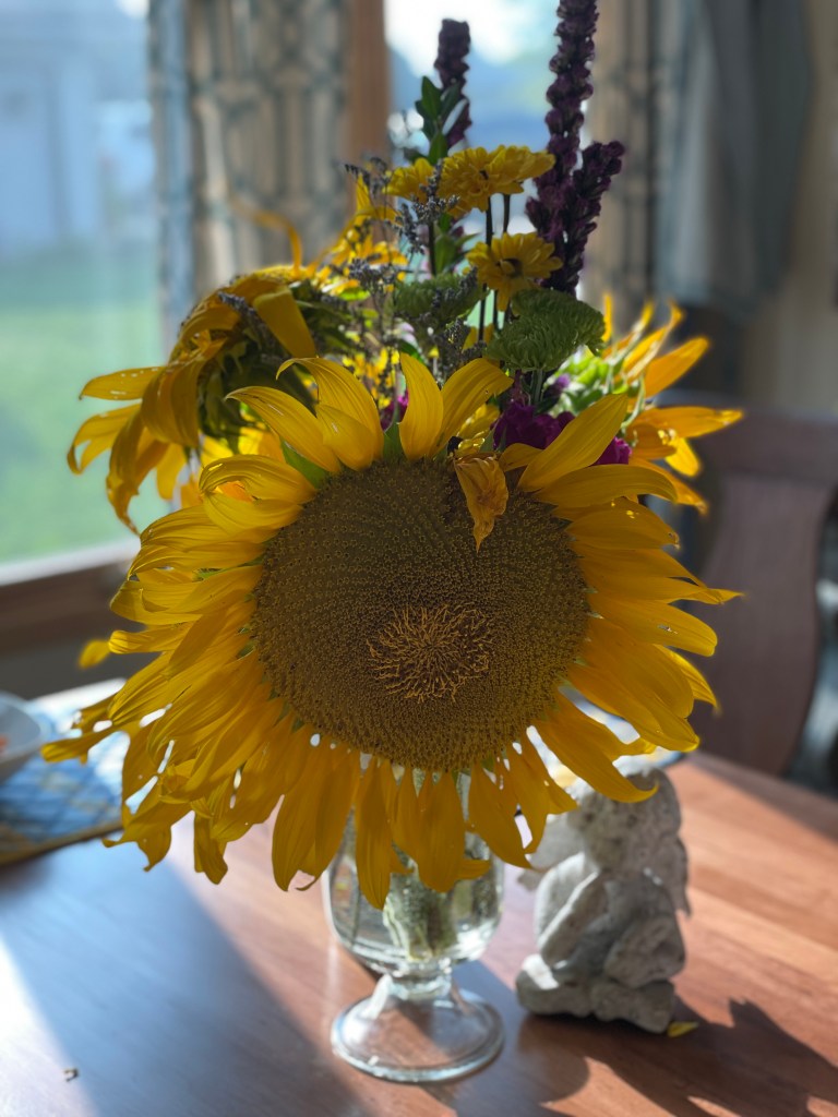I’m thankful it was a beautiful day outside, and also for these sunny flowers from the yard that I combined with a few leftover flowers from those sent to me after my surgery.