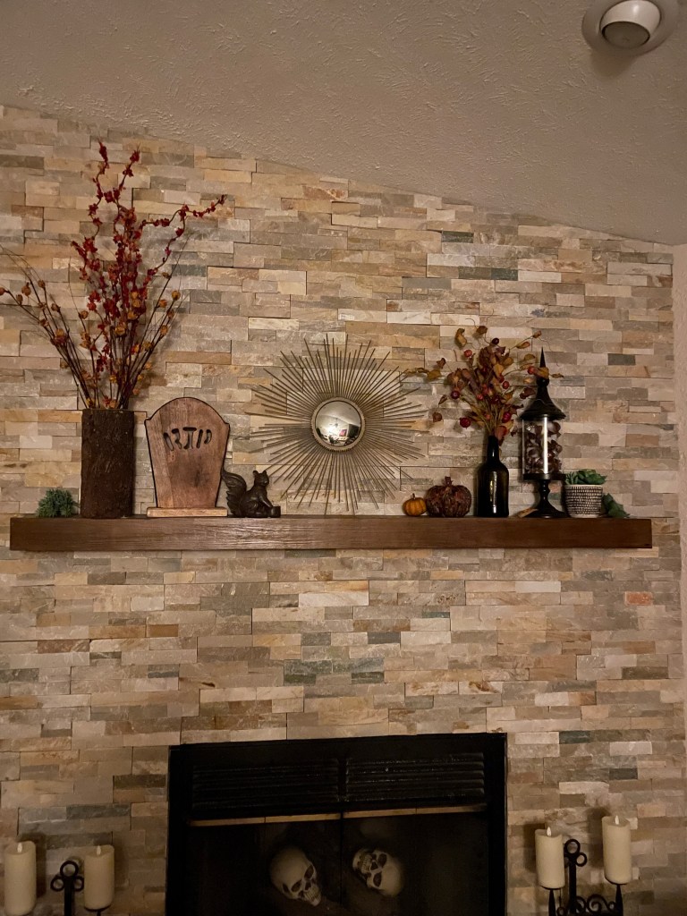 It was another beautiful day for us, sunny and yet cool. I hate to push summer out, but it’s really starting to feel like fall. So much so that I spent most of the afternoon taking down summer decor and adding fall touches. I had to sneak in a touch of Halloween to our fireplace. That tombstone I got yesterday was too cute to put away.