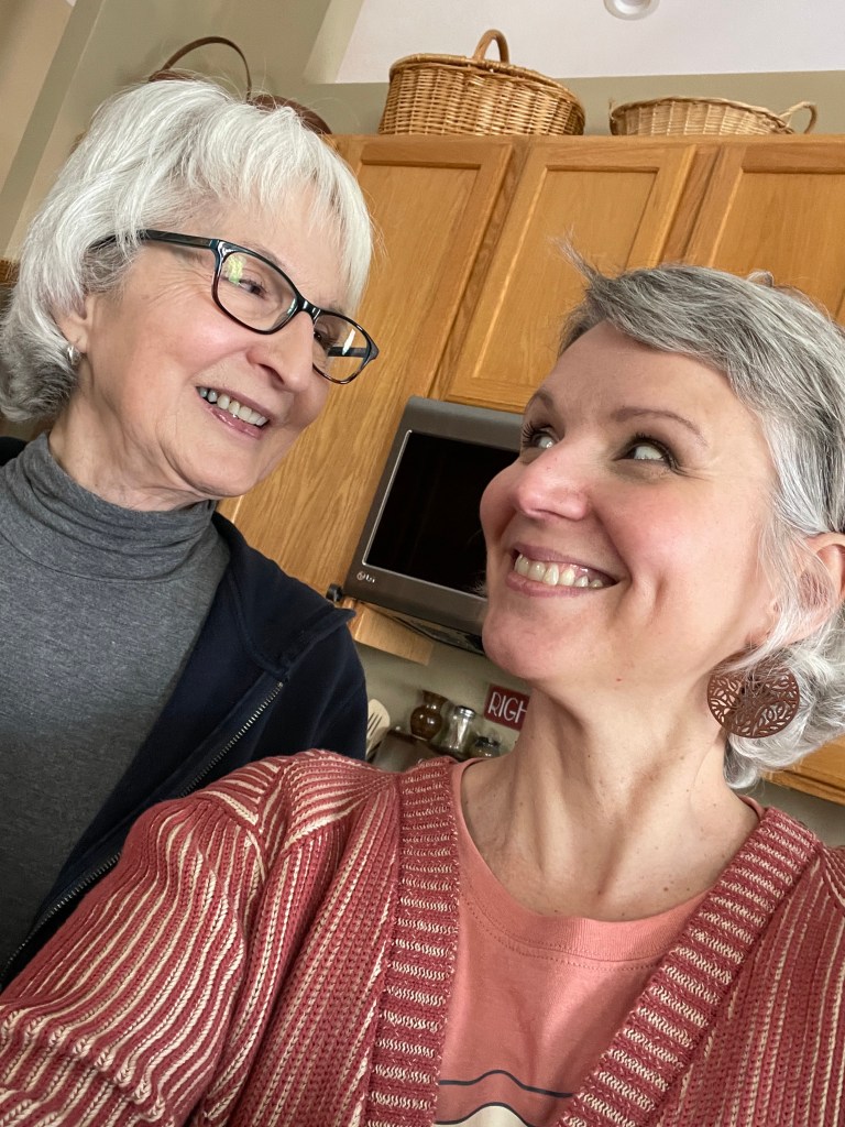 I left the house today! And I visited with a couple of friends today. One had texted me that she was looking to get rid of some items and thought I might want to look at them for my vintage booth, so I stopped over this morning. It had been months since we saw each other in person, so after loading my car with the items I decided to take, we caught up over coffee and apple cider donuts. Mmmm. We also compared hair because she had recently decided to stop coloring hers. We are almost twins!