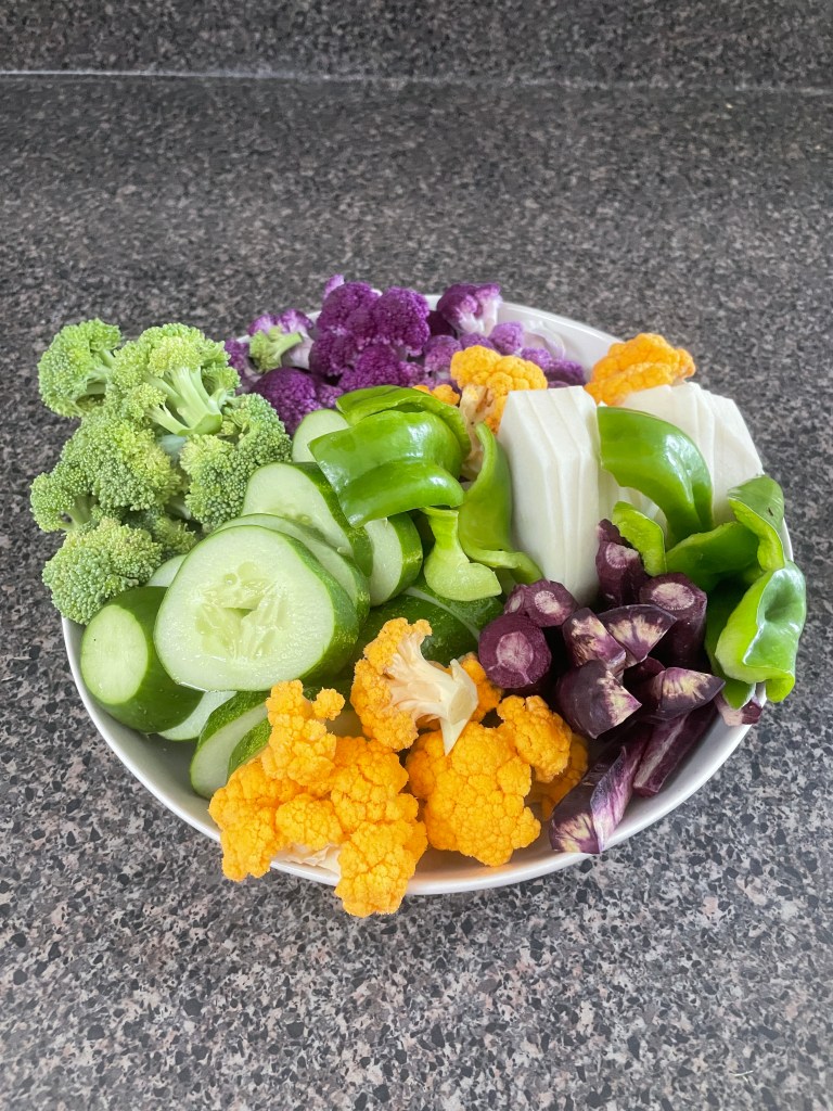 We went to a couple farmer’s markets today. It was super warm but look at this amazing plate of colorful vegetables. So worth it. I feel healthier just having this stuff in our house.