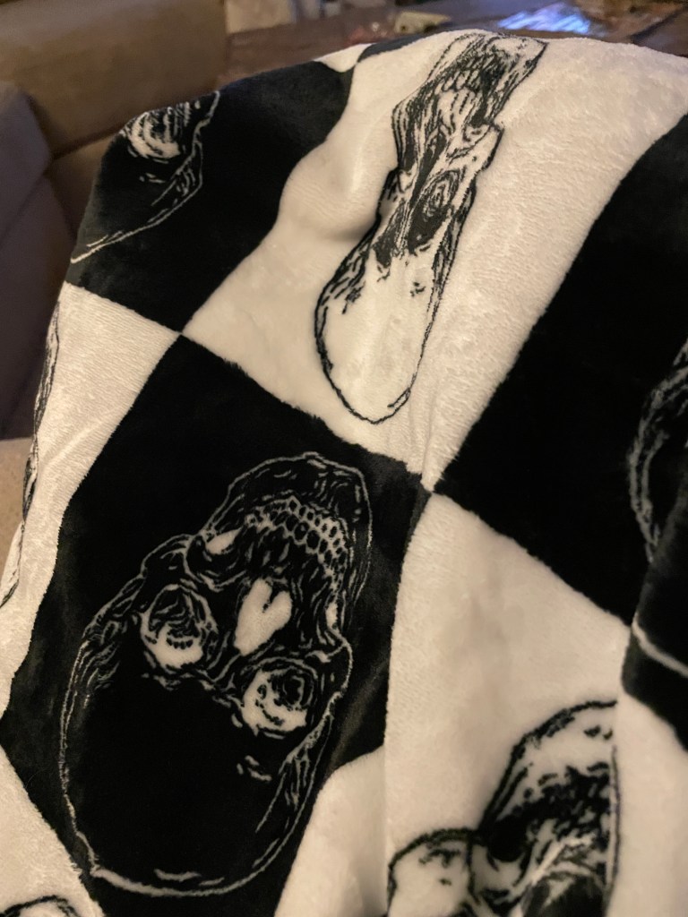 I’m also thankful for my work friends who have my back. And feed my love of Halloween and skulls. I had to literally fight Barley who kept trying to yank this soft blanket from me.
