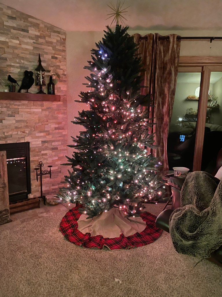 I’m thankful today for fun at work, a painfully good massage, fun wrapping paper, a nice glass of wine, and Christmas tree lights. A wee bit early. I put on the fire feature so at least the colors are Thanksgiving-ish.