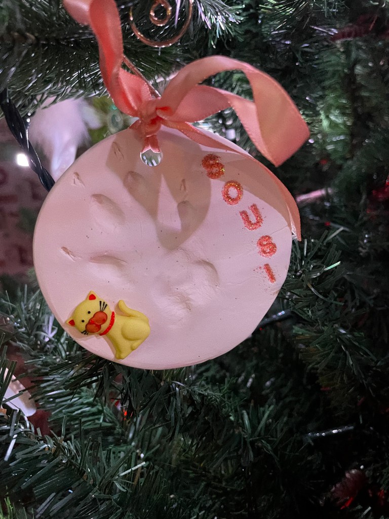 When we had to put down our 18-year-old cat a couple of years ago, the clinic offered different memorial options. We asked for his paw print but never got it. We were pretty upset over his loss at the time and just chalked it up to a miscommunication. But the other day, the clinic contacted Patrick because they had the print after all. It was just overlooked. Today I attached a hook and put it on our Christmas tree. I’m so thankful for this unexpected memento today.