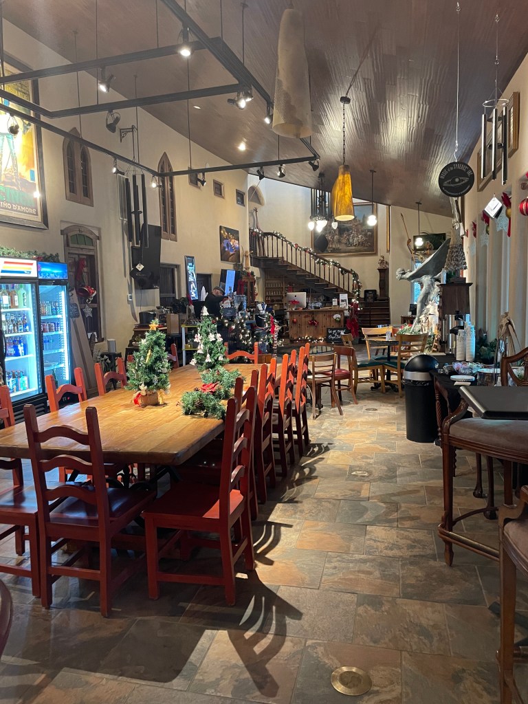 Then after a relaxing morning, Patrick, his sister Meg, and I went wandering through a shopping area before going to a place called Fang and Feather. Patrick has been watching YouTube videos from The Whiskey Tribe for a while now, and Fang and Feather is the whiskey tasting room from the show. He’s been there before, but I hadn’t seen it in person, so I was curious to go. It’s in a picturesque location outside Austin on a campus that also includes a whiskey school, wedding chapel and coffee shop.