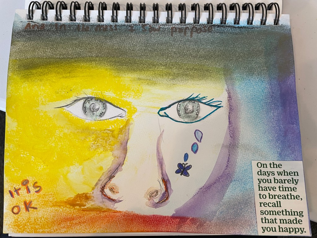 I had my last art therapy class today, and we did group art. We had just a few minutes to add our imprint on someone’s artwork, and everyone added something to each person’s. I started my artwork with the eyes, and the end result was exactly me. I’m thankful for meaning in unexpected places.