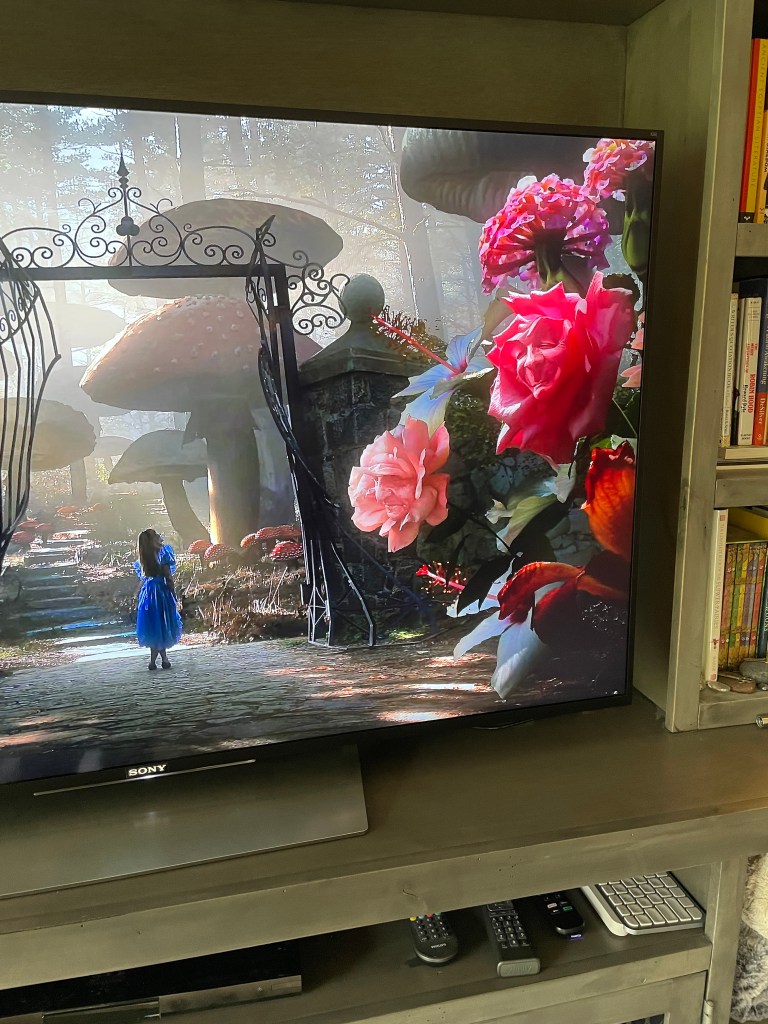 We were invited to a surprise birthday party today for a friend. The hostess used an Alice in Wonderland theme which was super cute. Since I’m awful with taking pictures, I got none except for the tv still for the soundtrack they were playing. I loved the flowers and figured I might want to try to paint them someday.