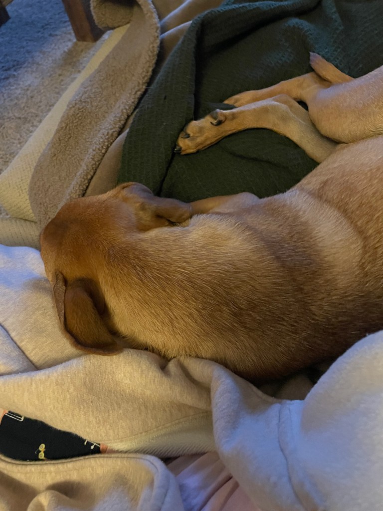 And Cooper is getting acclimated. He’s slightly better at listening and stopping when we say no to things. And he makes no fuss at going into his cage at bedtime or when we have to leave the house briefly. We need to work on the puppy stuff like jumping on people or grabbing everything he sees, especially if it’s fuzzy or moving. My feet seem especially interesting. Since he’s 6 months old, I know that won’t last a lot longer, so we just need to take it a day at a time.