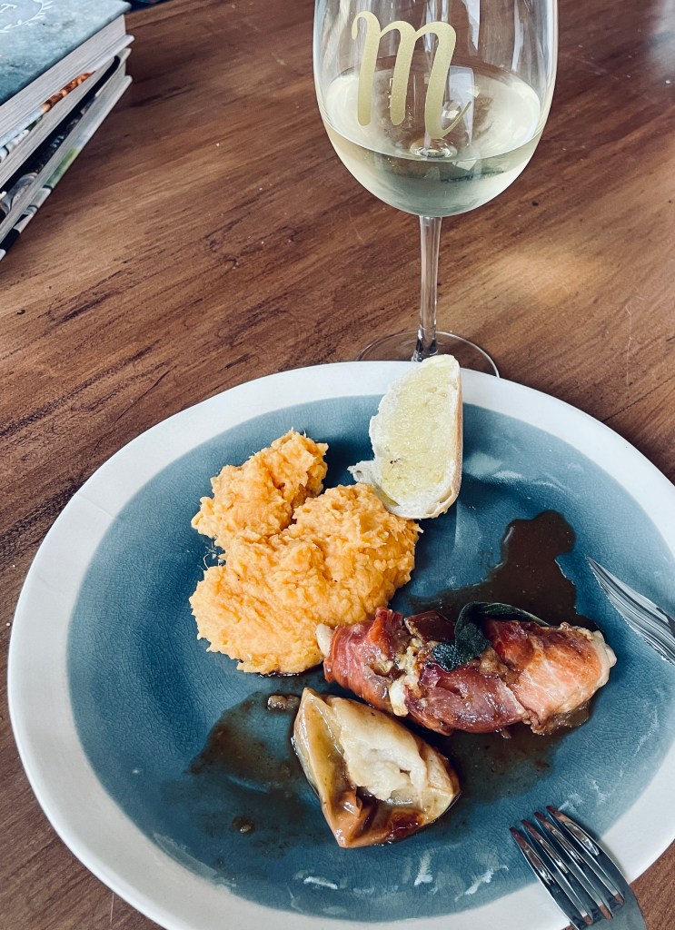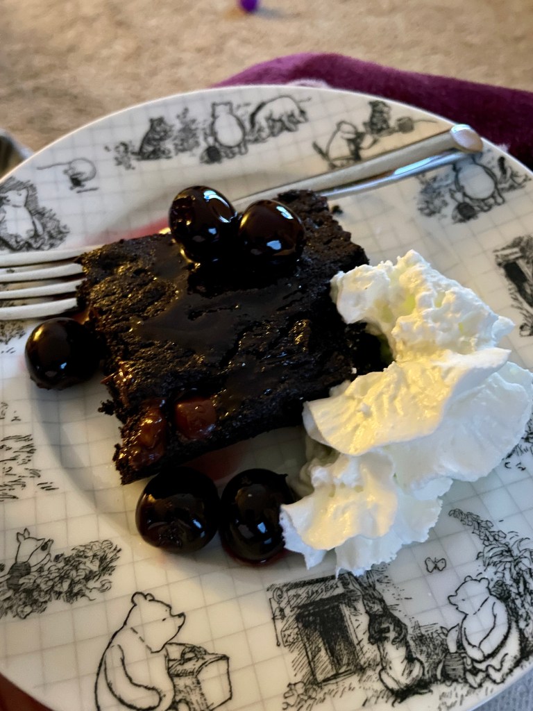 It was a drizzly, fall-ish day, today, and since Patrick had to work late, I decided I would cook dinner. Because Patrick enjoys cooking, I haven’t made dinner in a long time. I wanted to find something that resembled comfort food but also something new for me. I ended up choosing a chicken dish that used blue cheese, apples and prosciutto in a wine sauce with a side of mashed sweet potatoes. It required getting some ingredients, so since I had to do a grocery run, I added brownies to the menu. Only I forgot to grab a box mix. Luckily, we had enough baking cocoa to make them from scratch. And thankfully, everything turned out well. Even Patrick liked it.