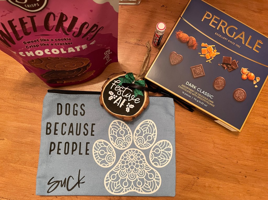 I’m thankful for my massage especially since it was a gift from a friend. I’ll schedule another one soon. I’m also thankful for a surprise visit from another friend who dropped off a late birthday present. How funny is that bag and ornament? So sweet.