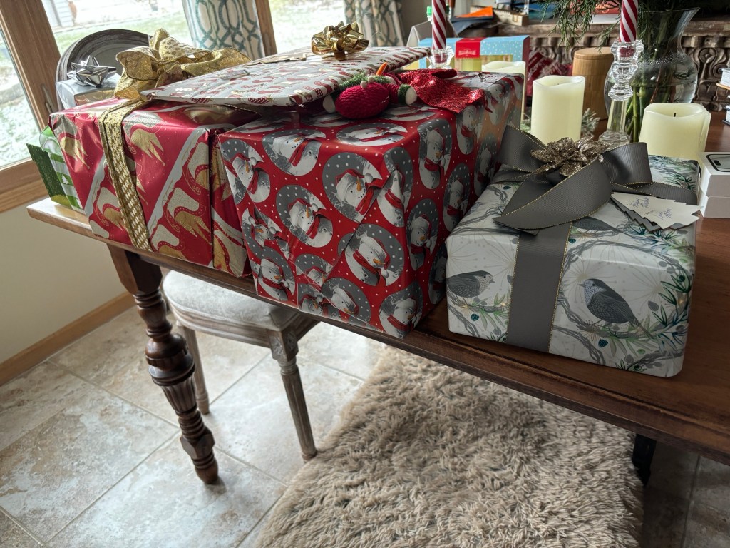I was disappointed that my mom couldn’t come visit, but my sister and brother-in-law came to town for his family’s late Christmas. And they dropped off Christmas presents from my mom. They looked so pretty I almost hated to open them.
