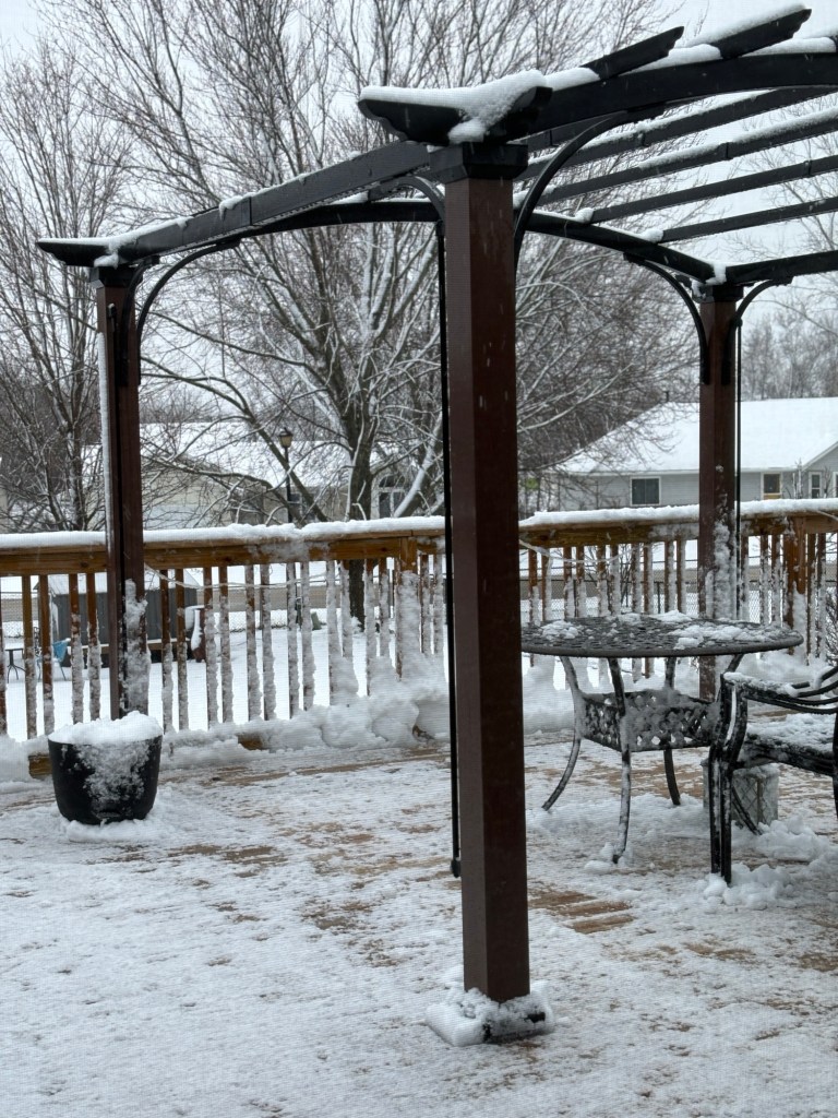 We got a bunch of rainy snow today. It was forecast to be heavy and cause bad driving conditions, so a lot of folks stayed home from work. I ended up leaving early, hoping to avoid the worst of it, but I think I ended up driving home when the roads were the most crummy. Oh, well. I made it home without incident and got to enjoy how pretty the snow made everything. I’m thankful things weren’t as bad a predicted.