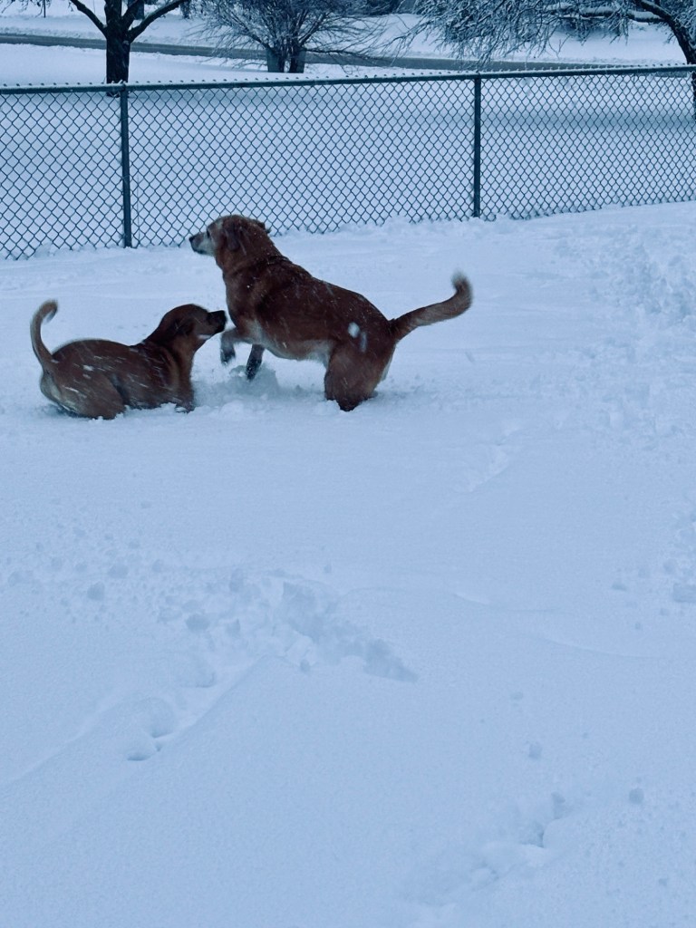 Also, the snow is pretty. And Cooper experienced the deep snow for the first time. We got about a foot by dinner time, and he barely stood above it. He and Barley had fun trying to catch snowballs and chasing each other, and we had fun watching them.