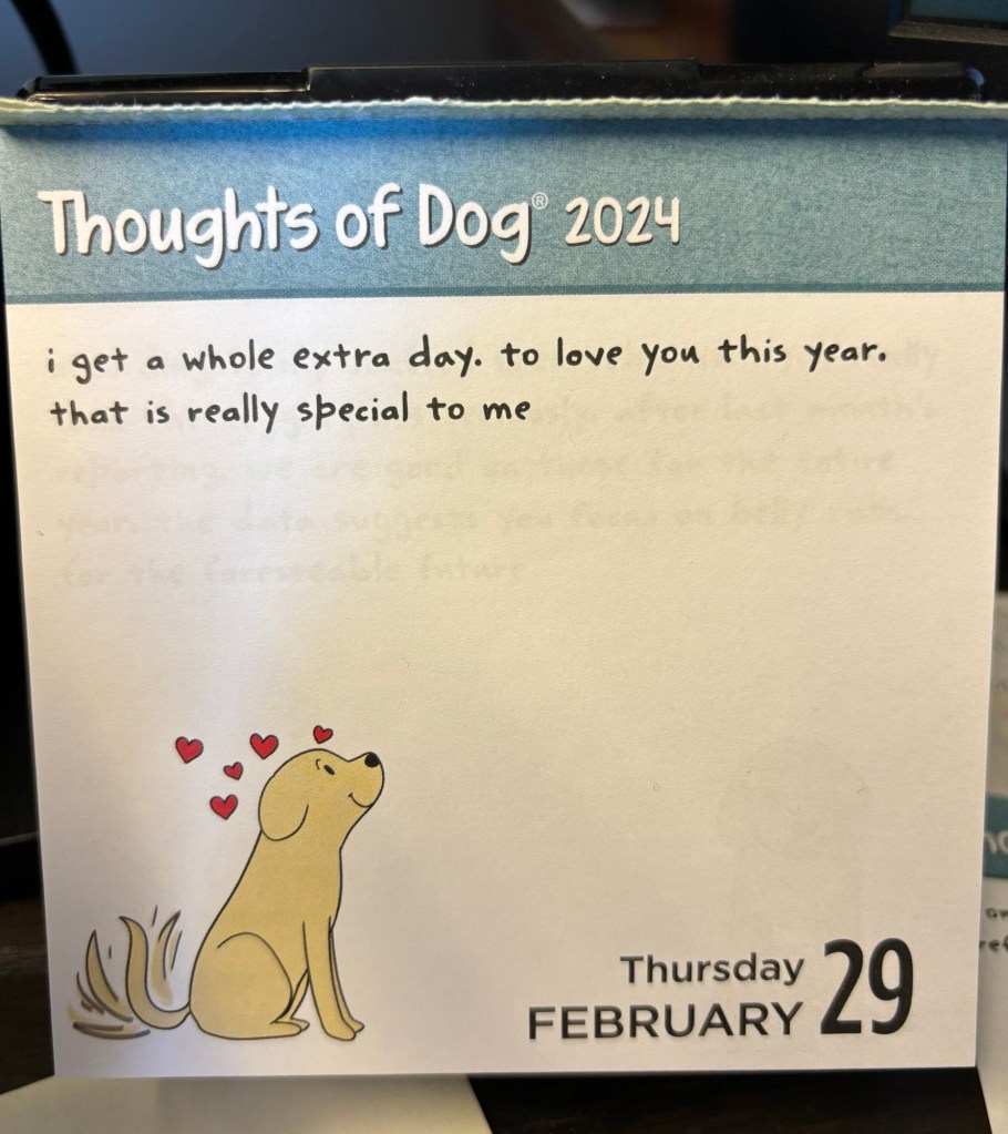 February 29, 2024 Posted on February 29, 2024 by mclements43 under Uncategorized Happy Leap Day! I’m thankful for the extra day to snuggle the pups and hang out with Patrick. Share this: Click to share on X (Opens in new window) X Click to share on Facebook (Opens in new window) Facebook Like Loading... Related
