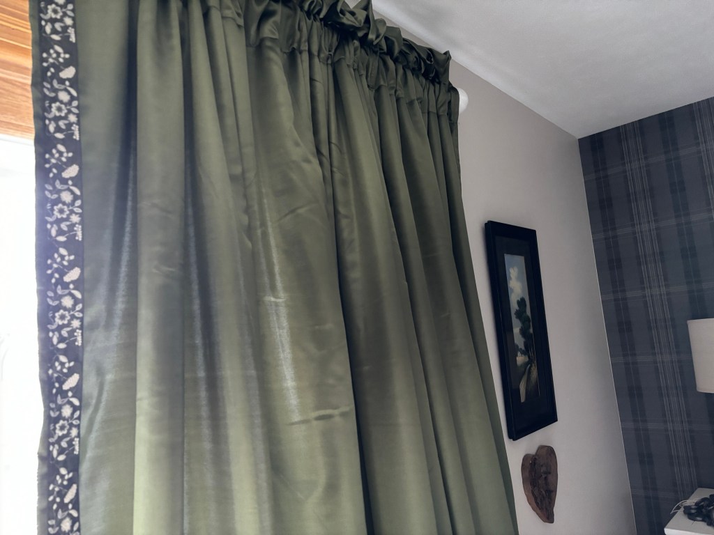 I had 3 things I needed to get done this weekend, and I did! Yay! Yesterday I got my hair done. Today I got the trim put on our bedroom curtains. I like that it adds just enough gray to tie into the wallpaper.
