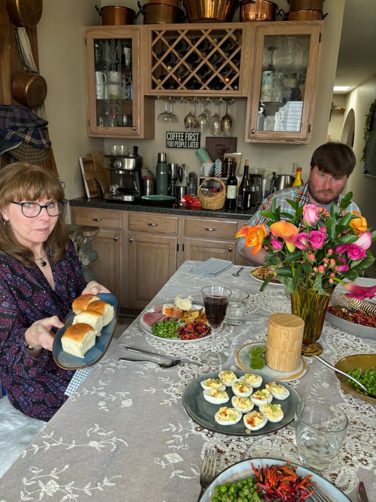 We had Ann over for early dinner (late lunch?) which was also good. Patrick smoked a ham and made a beet salad and potatoes. I made deviled eggs and that lemon meringue pie. They were both ok. Not as good as Ann’s lemon cookies she brought.
