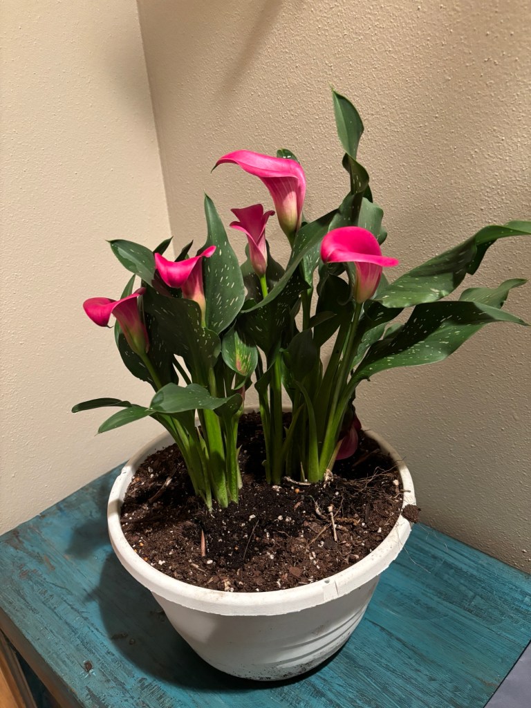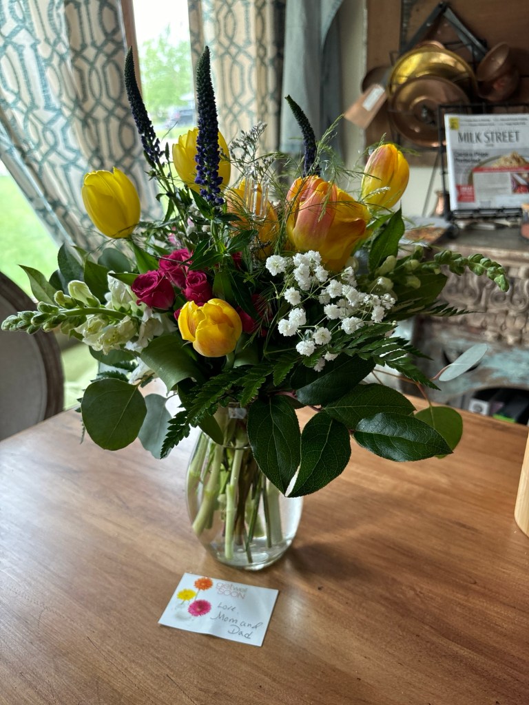 I am thankful that I was finally able to shower, and that I did spend most of the day relaxing. I even watched a movie.And I’m grateful for the beautiful flowers this week from my in-laws and a friend. I love how they brighten up the house.