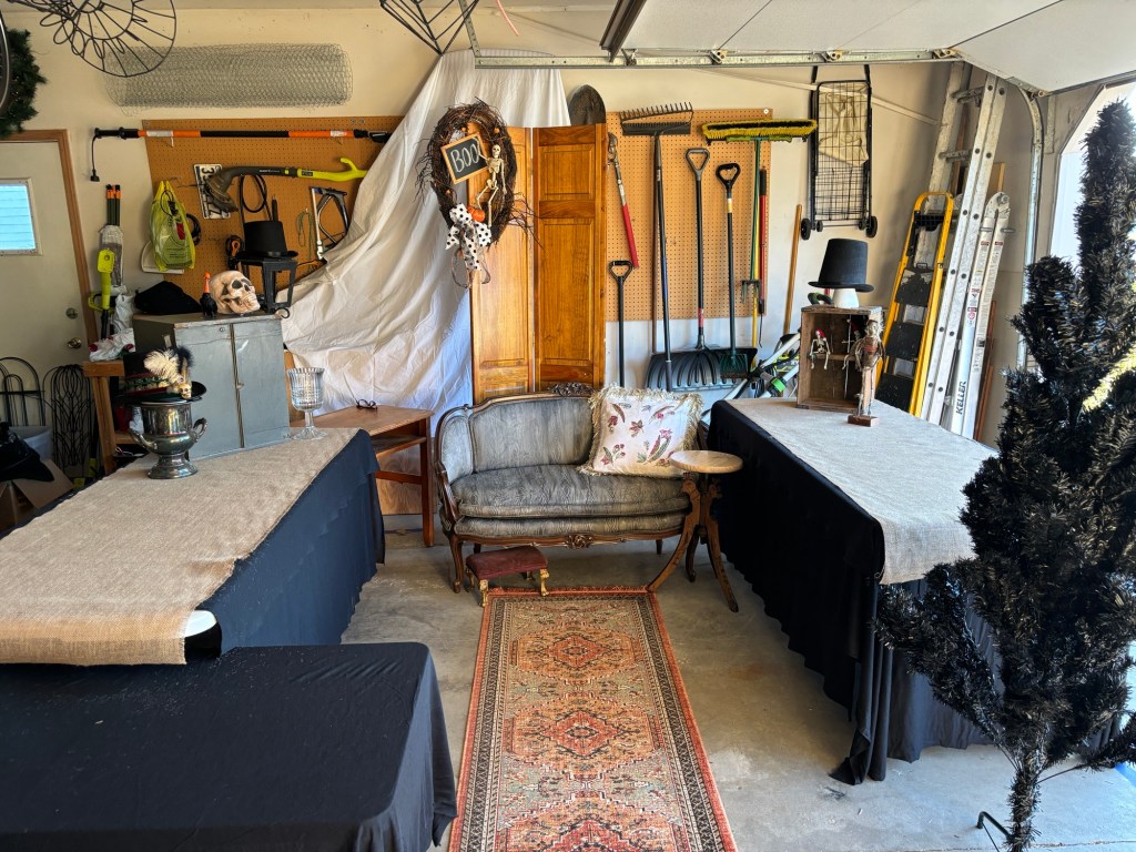 But I’m pretty happy with the layout I settled on. Hopefully, it works once I’m on site. I think it’s a good blend between Halloween and vintage. I’ll hang my skeleton and clay ornaments on the tree, and I’ll have a place to sit with the settee there. I think the fabric looks like wood after I painted it.