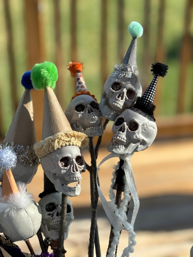 But I worked hard today. So did Patrick. After cleaning up a bit and swapping out some of my greenery around the house with fall leaves, I worked on more crafts. Party skulls anyone?