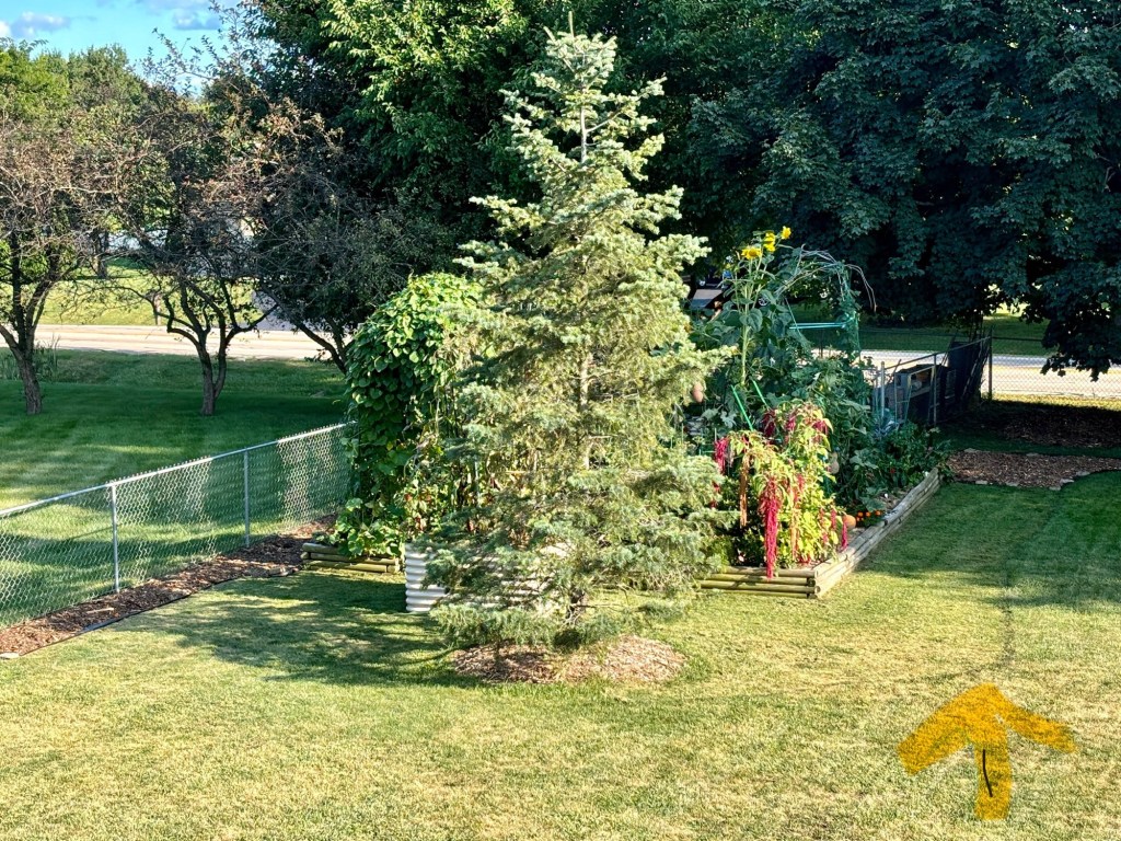 Patrick worked on expanding the garden area by paying down mulch in spots where he wants the grass to die off. He found a business about 20 mins away that’s giving away free mulch and has been bringing it home in totes. He’s going to need a lot more. the yellow area shows the faint black outline of where the edge of the new garden will go.