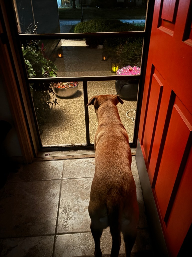 It never fails, it gets so windy here around Halloween, and it really picked up today. I ended up putting away most of the outdoor stuff because it kept blowing over, including the ghosts. Talk about boo. Because of the wind and the drop in temperature, we also didn’t get a lot of trick or treaters. After about an hour or so, we thought we might be done for the night. I set the candy bowl on the stoop just as a new wave of kids showed up. I’m thankful the dogs didn’t go as nuts as we expected. In fact, Cooper did pretty good. He kept his eyes on the candy bowl.
