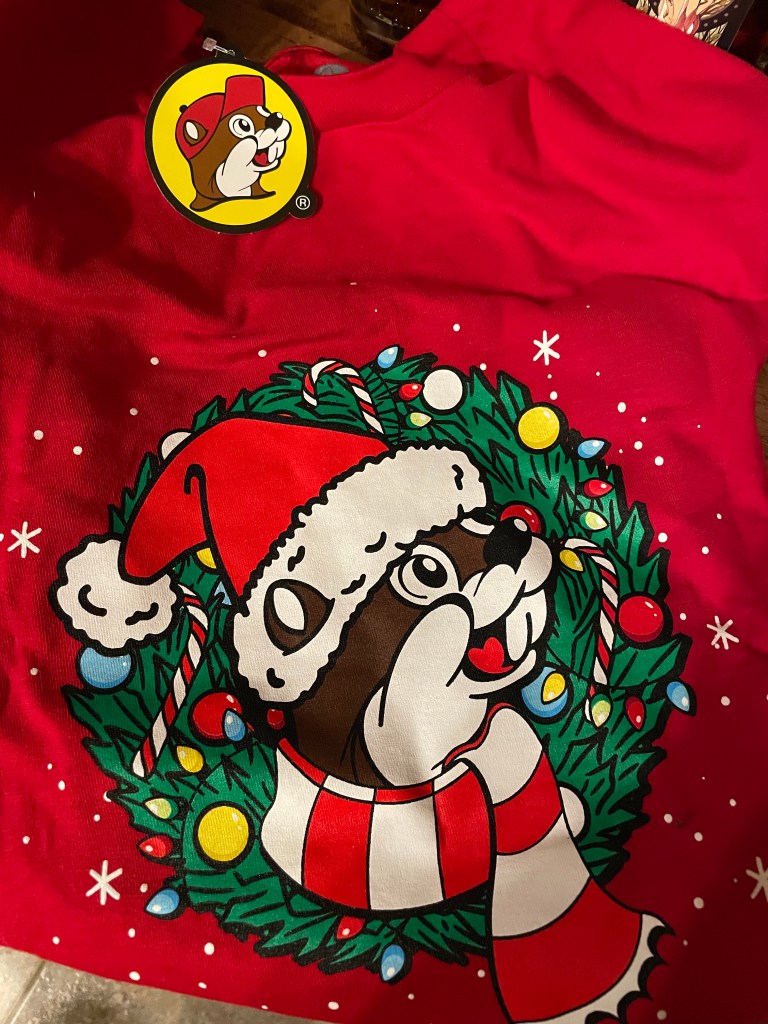 Yay! Patrick made it home safely. I’m thankful his trip went well and I’m happy to have him back. So are the pups. They were a bit mopey this evening, probably because I wasn’t in the best of moods today, so they were pretty excited to see him show up. He brought Christmas presents from his parents, so it now looks like Santa visited here already. And he brought me this cute t-shirt from Buc-ee’s, which is a Southern convenient store chain. Happy holidays!