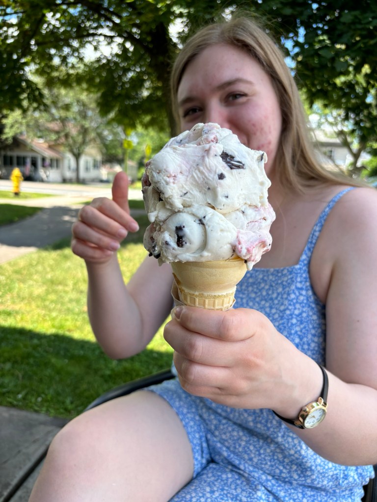 A travel day is always stressful for me. Making sure I have everything packed and knowing that I have to be somewhere at a specific time puts a real damper on any free hours that might be open ahead of time. Today my flight wasn’t until 4:45 pm, and Emma lives 10 mins from the small airport I was flying out of, so we knew we had most of the day to do something. We decided to visit an Irish restaurant she likes for lunch after church, only to find it unexpectedly closed for the day. Without a lot of time for a secondary plan, we went for an ice cream lunch closer to her home. It was a good choice. The servings were crazy big and the ice cream was delicious.