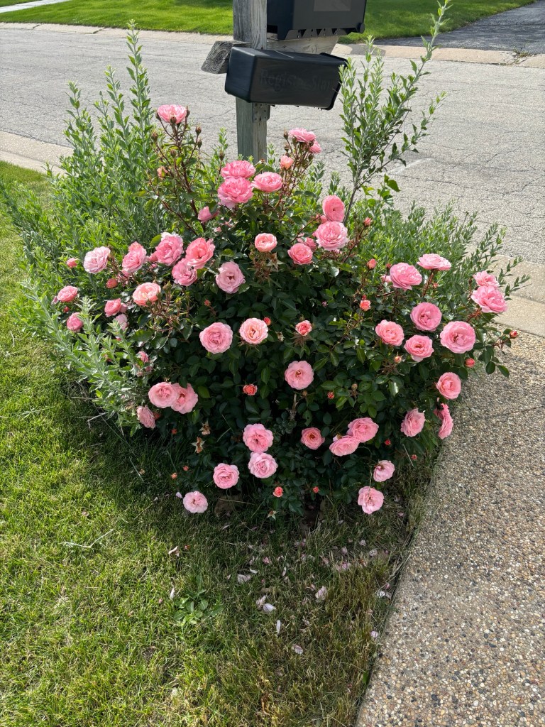 I love this rose bush that has gotten crazy big this year. It’s so pretty. I’m thankful to have my flowers blooming while Patrick’s garden is growing.