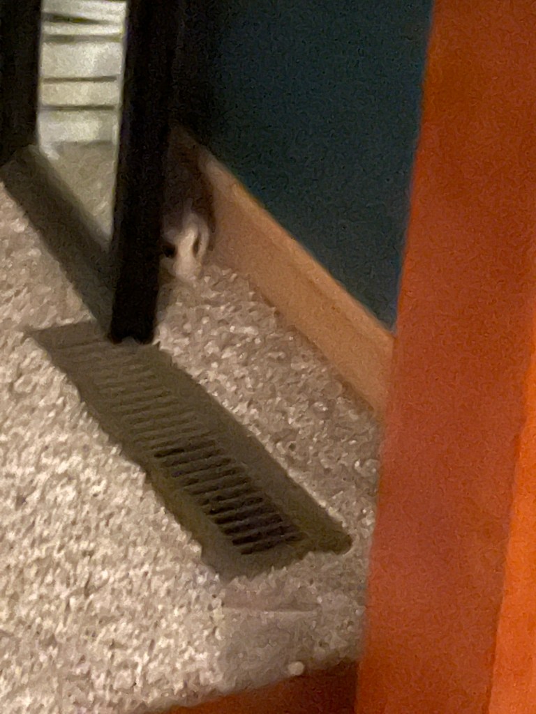 That’s a baby possum. A possum. This is how I imagine he ended up in the corner of our bedroom. Chance discovered him in the backyard during his early morning bathroom run and carried him in through the doggie door. Maybe he played with him for a while downstairs until the possum played dead before carrying him to our room. I suspect Chance then jumped up on our bed with him at which point he dropped him, and the little guy scampered to his hiding spot behind my mirror. Or maybe they planned it all as an elaborate alarm for my first early, early morning.