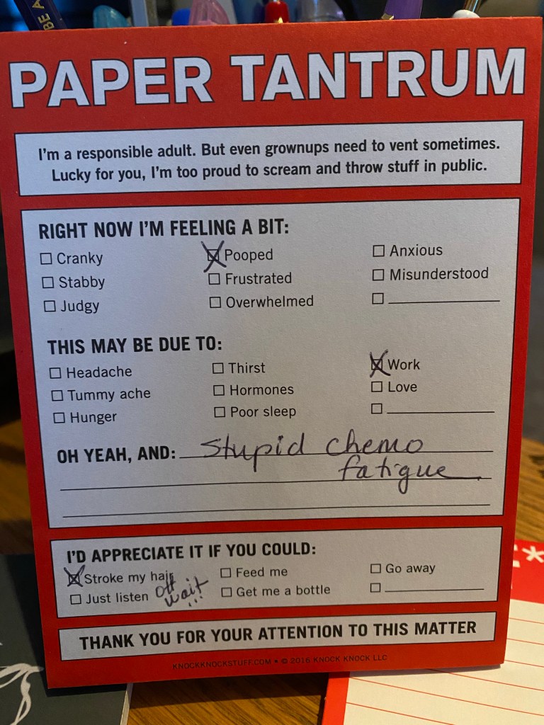 While we certainly wish for each other not to have cancer, we have admitted that we find it comforting to have someone to commiserate with who gets it firsthand. In real-time. Today, checking in and being able to laugh about some of our difficulties helped lighten the load a bit. I’m thankful for our friendship.