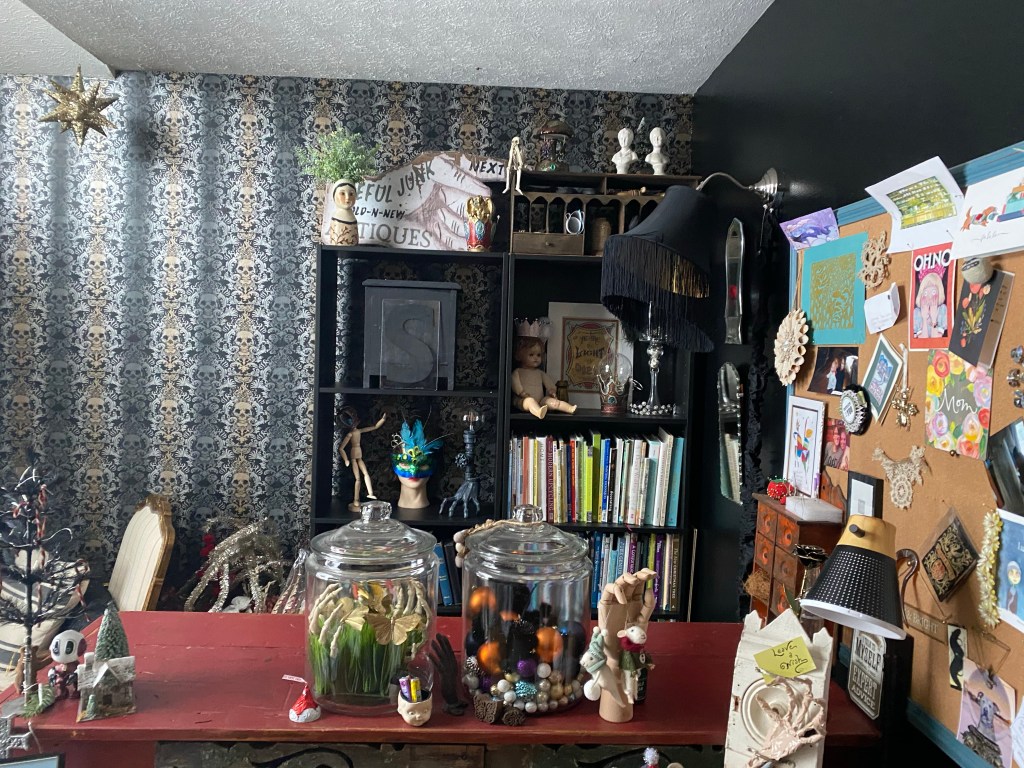 When my kids moved out, we repurposed their rooms. One became a guest room and the other became my craft room. I’ve redecorated it several times, and I suspect I may rearrange or redecorate it more before I’m done. But right now I’m satisfied with it. It makes me happy to hang out in and work on my latest project. This room is different than the rustic, neutral look of the rest of the house. I have a thing for skeletons, so you’ll notice them around the space. I think it comes from my appreciation of things gothic and quirky, and it’s enough to have it confined to my craft room. I’ve also filled it with items that are memories for me—cards from my kids, photos, drawings, gifts from friends, and tidbits that are inspirational.