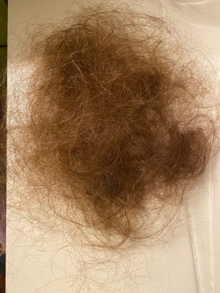 First off let me say that losing your hair is difficult to describe. It’s weird. I thought I was prepared but I’m not sure anyone really is. Running my fingers through my hair resulted in a fistful of strands. Eventually, I’d notice hair hanging lower than others and if I tugged on it, it would pull out in clumps.