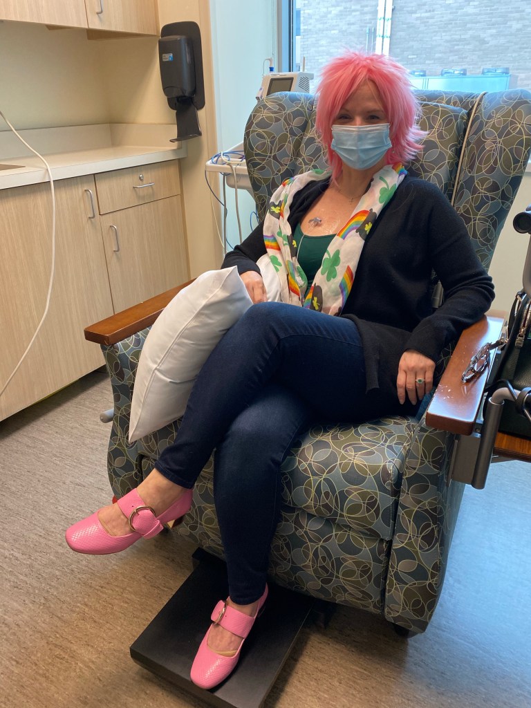 Even though I woke up at 4 am with a headache that made it nearly impossible to get back to sleep, I wanted to look lively for chemo today. I didn’t have a green wig, but I think my pink one worked with the fun scarf a friend gave me.